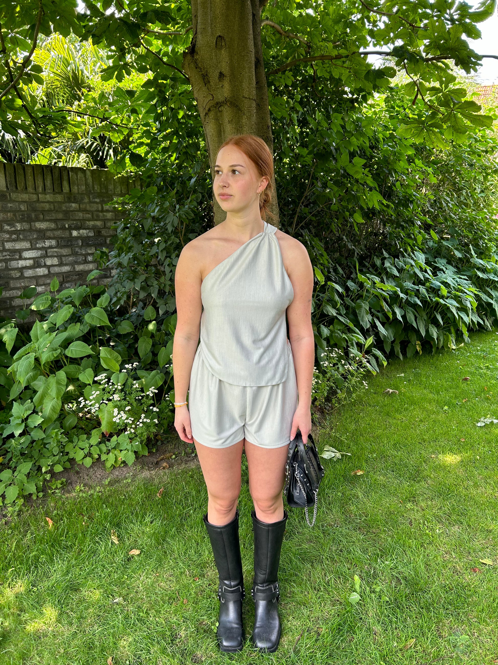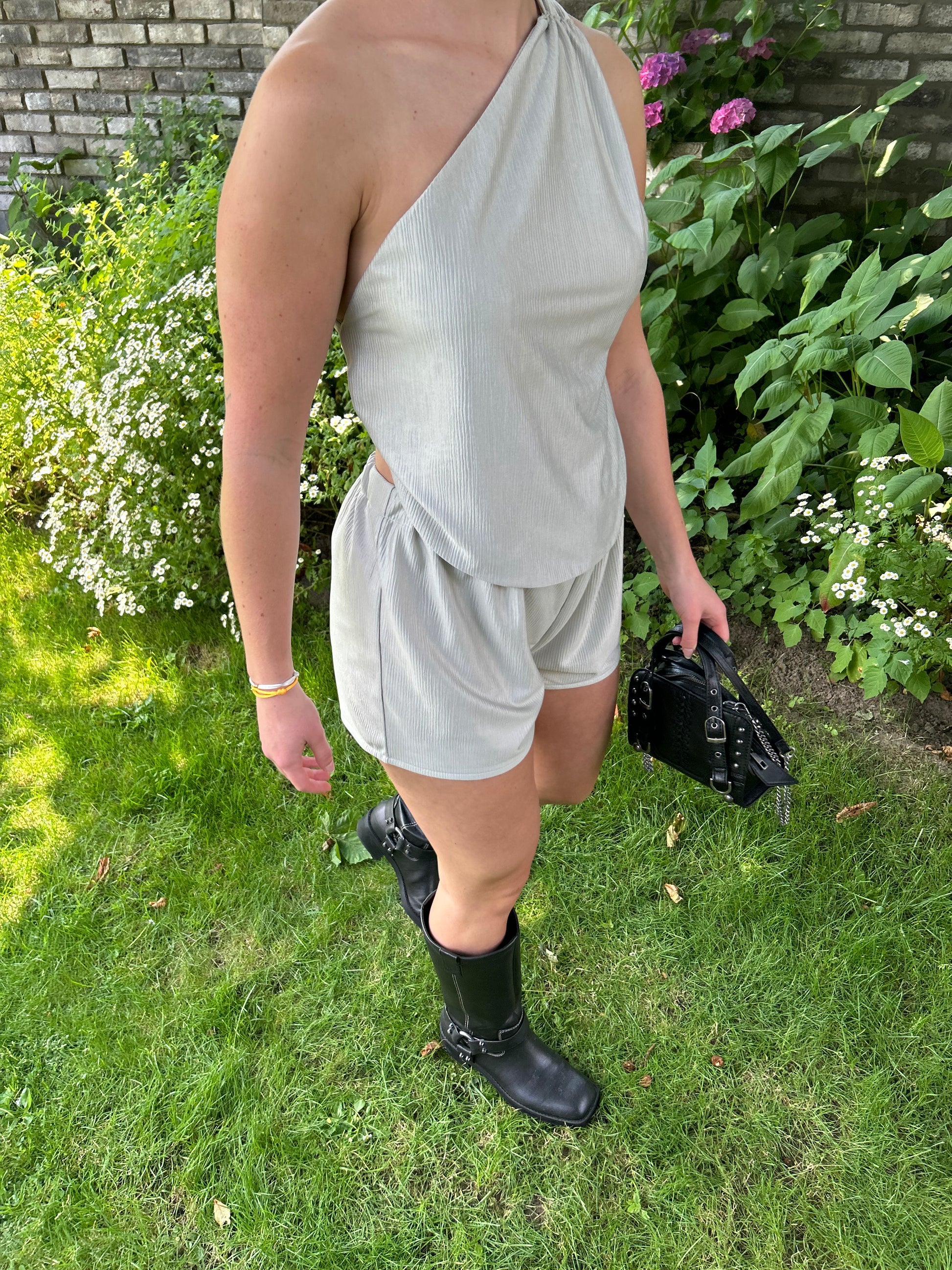 The perfect summer set. The light green color is amazing for summer days. The set fits comfortably due to the supple and light fabric. The top can also be combined separately. Evy wears the top with baggy jeans for a more casual look. Evy wears size XS/S. (Evy is 164 cm)