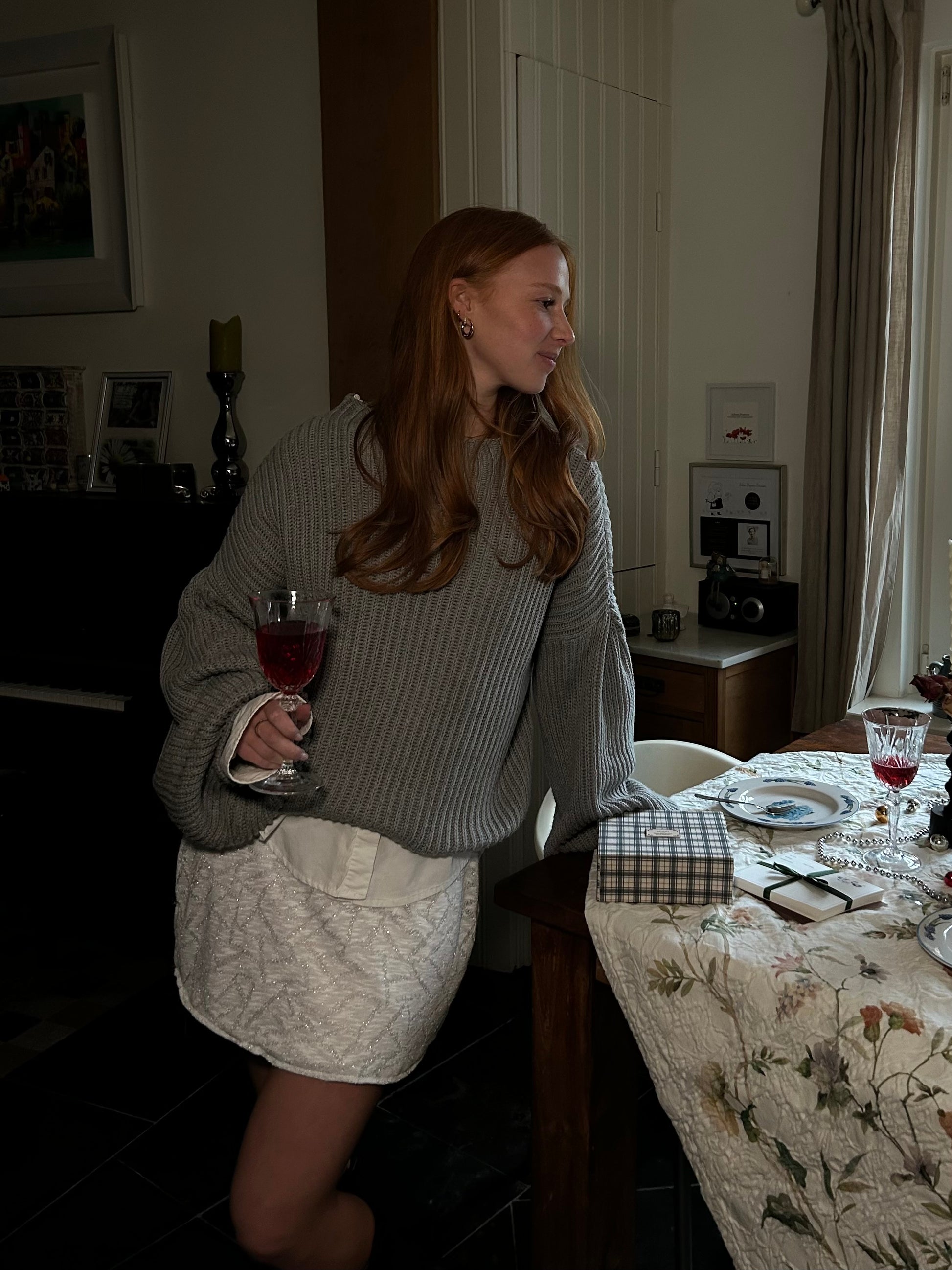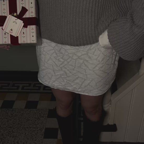 This mini skirt adds the perfect touch of sparkle to any outfit. It’s made from a soft white fabric with a subtle woven pattern and a delicate silver shimmer. Perfect for cozy, casual days paired with a warm knit, but just as lovely dressed up with a chic top for festive moments.Evy is 163 cm tall, has a 67 cm waist, and is wearing size XS.