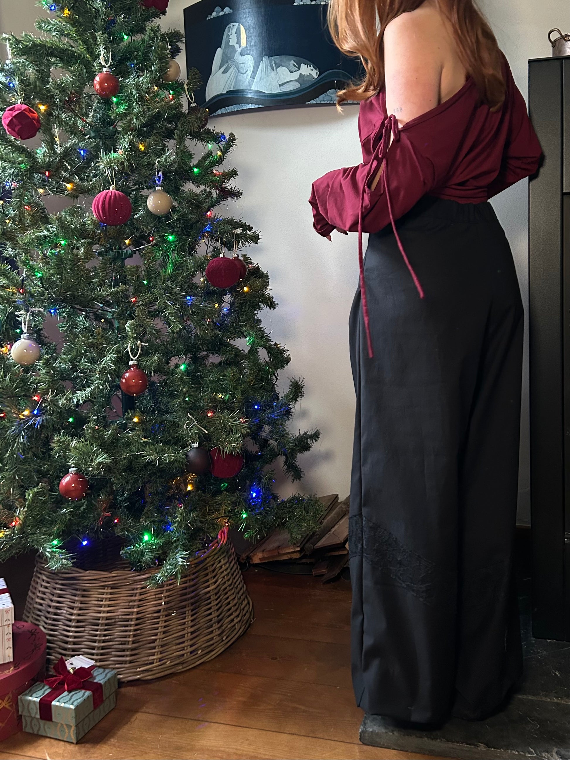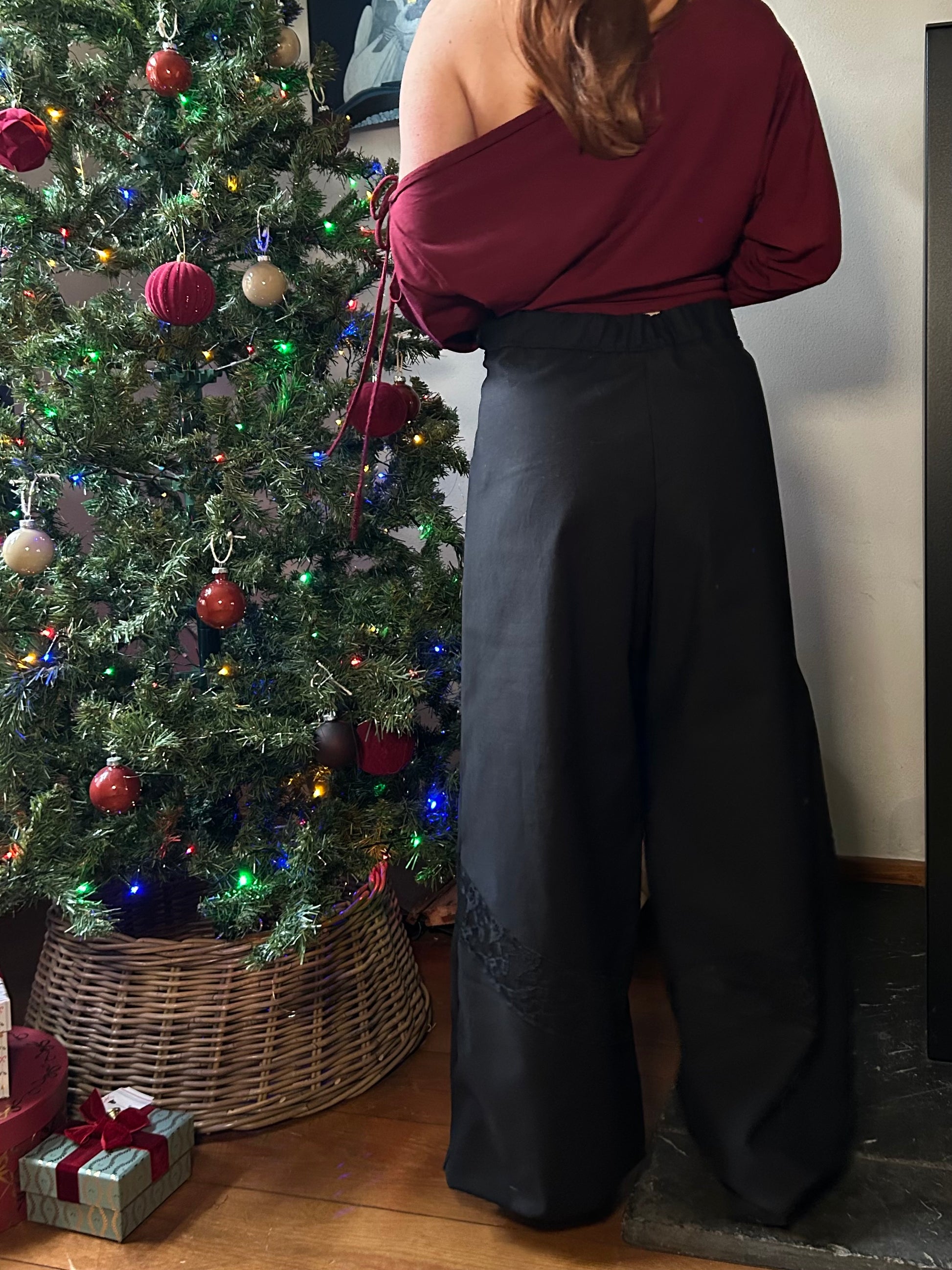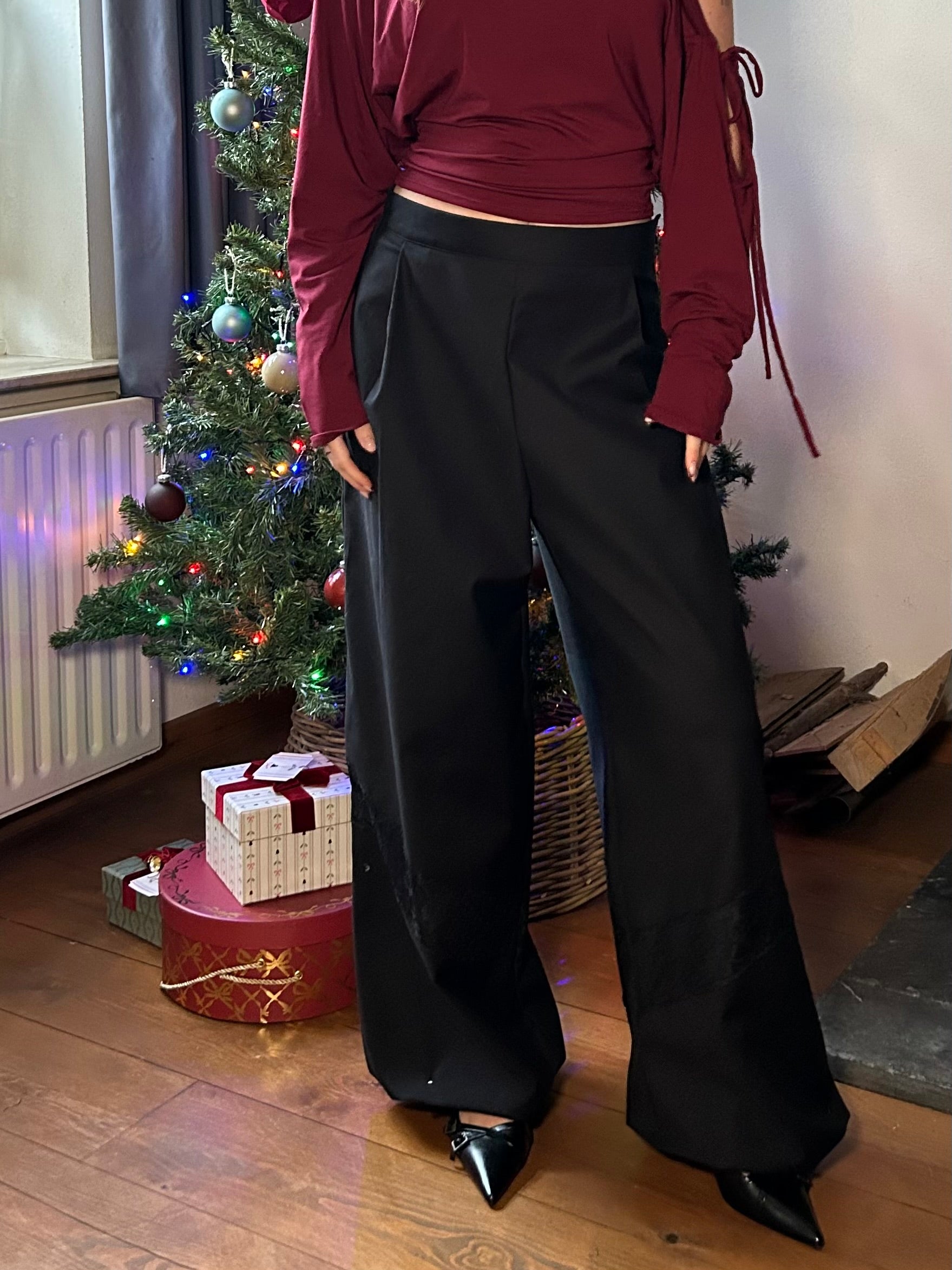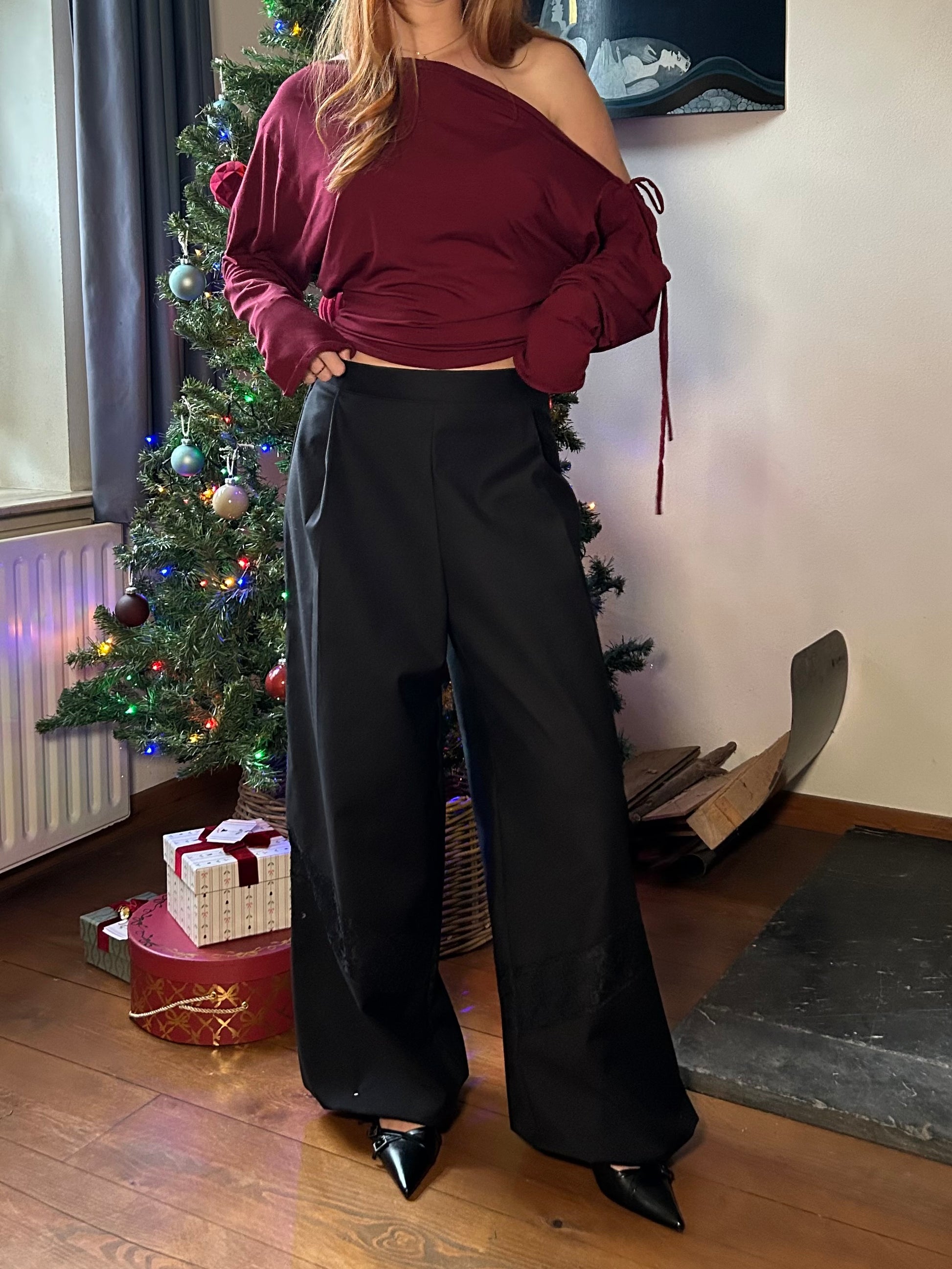 The prettiest autumn trousers. Designed with a wide fit, they feature a small side zipper with a button closure at the top, while the elastic section at the back ensures a comfortable fit. The pants are midwaist. Perfect with a cozy oversized sweater, or styled chic with a sleek top or blazer for a more polished look. The lace detail just below the knees adds a playful touch to any outfit. Evy is 163 cm tall, has a 67 cm waist, and is wearing size XS.