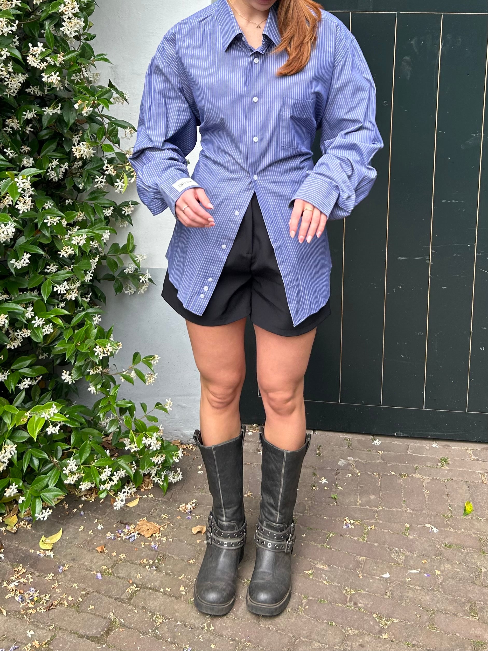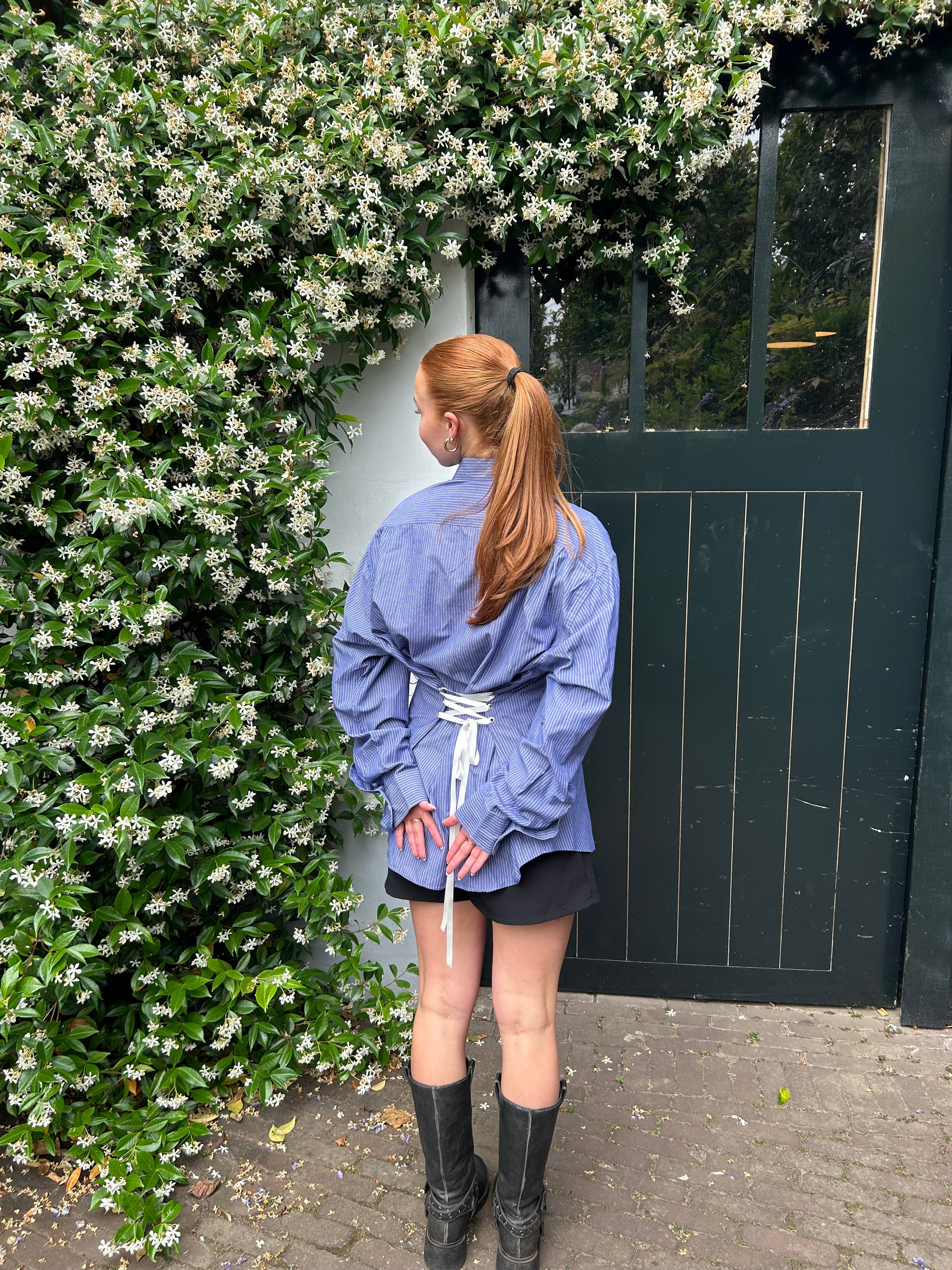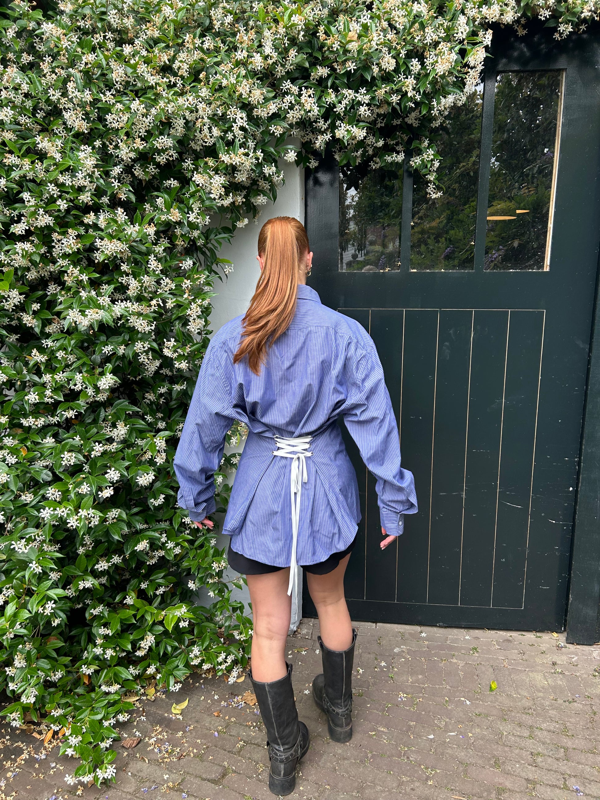 This upcycled blouse features rings with a ribbon at the back, allowing you to adjust the waist for a perfect fit. Style it just the way you like—casual yet effortlessly chic. Thanks to the adjustable back, the blouse fits sizes XXS to M. Keep in mind that the larger your usual size, the further apart the rings at the back will be.