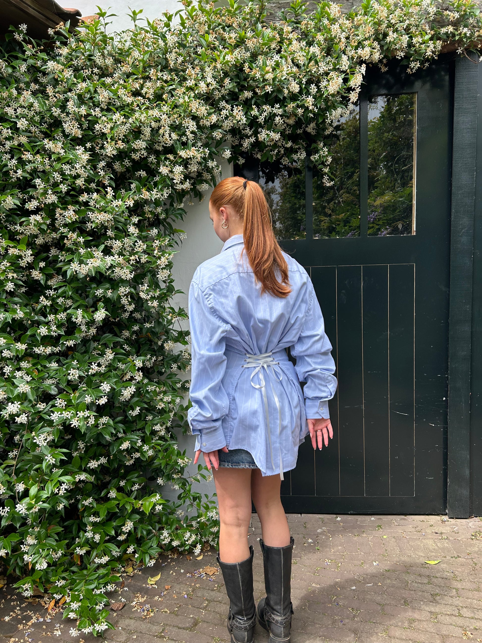 This upcycled blouse features rings with a ribbon at the back, allowing you to adjust the waist for a perfect fit. Style it just the way you like—casual yet effortlessly chic. Thanks to the adjustable back, the blouse fits sizes XXS to M. Keep in mind that the larger your usual size, the further apart the rings at the back will be.