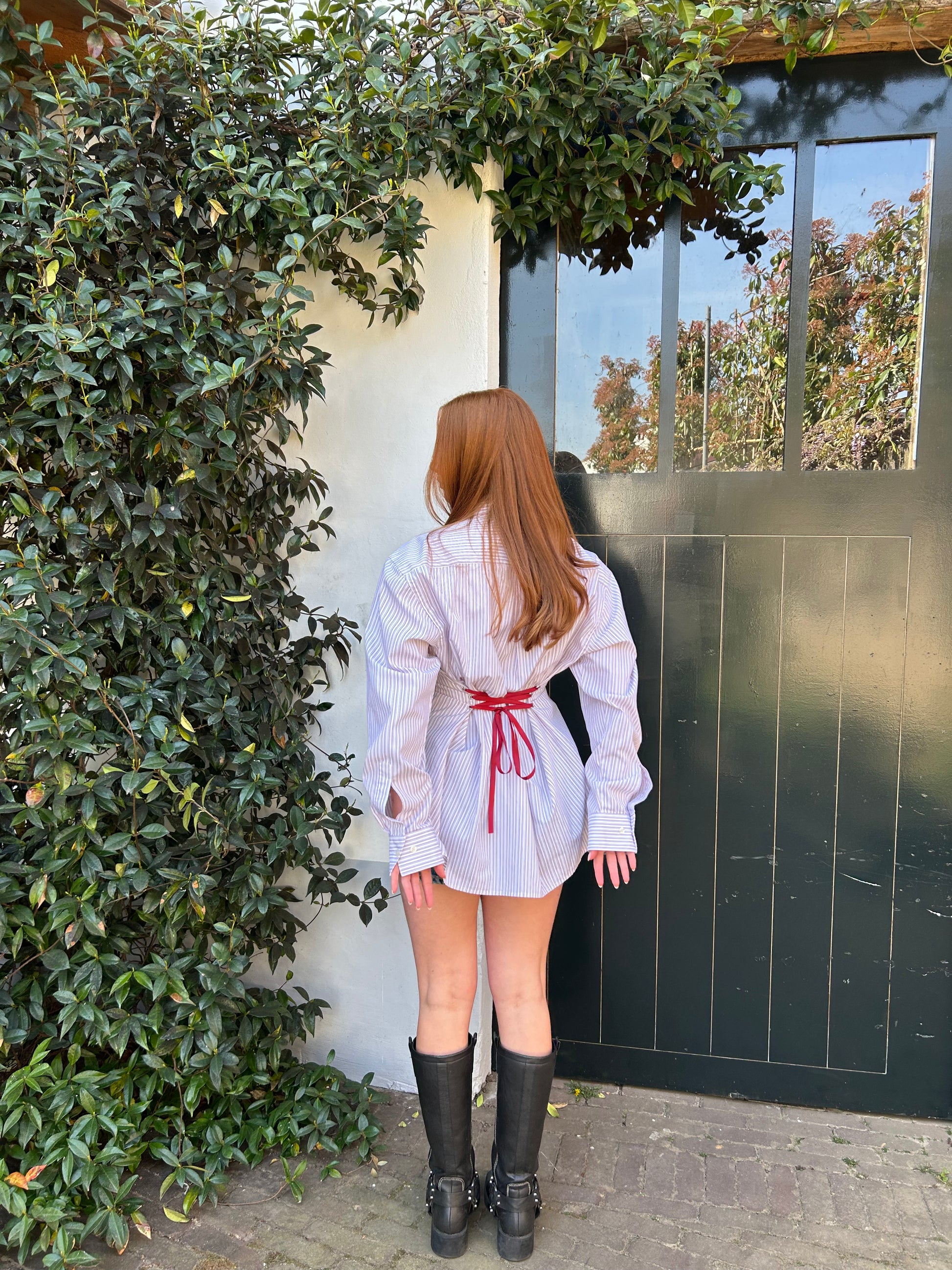 This upcycled blouse features rings with a ribbon at the back, allowing you to adjust the waist for a perfect fit. Style it just the way you like—casual yet effortlessly chic. Thanks to the adjustable back, the blouse fits sizes XXS to M. Keep in mind that the larger your usual size, the further apart the rings at the back will be.