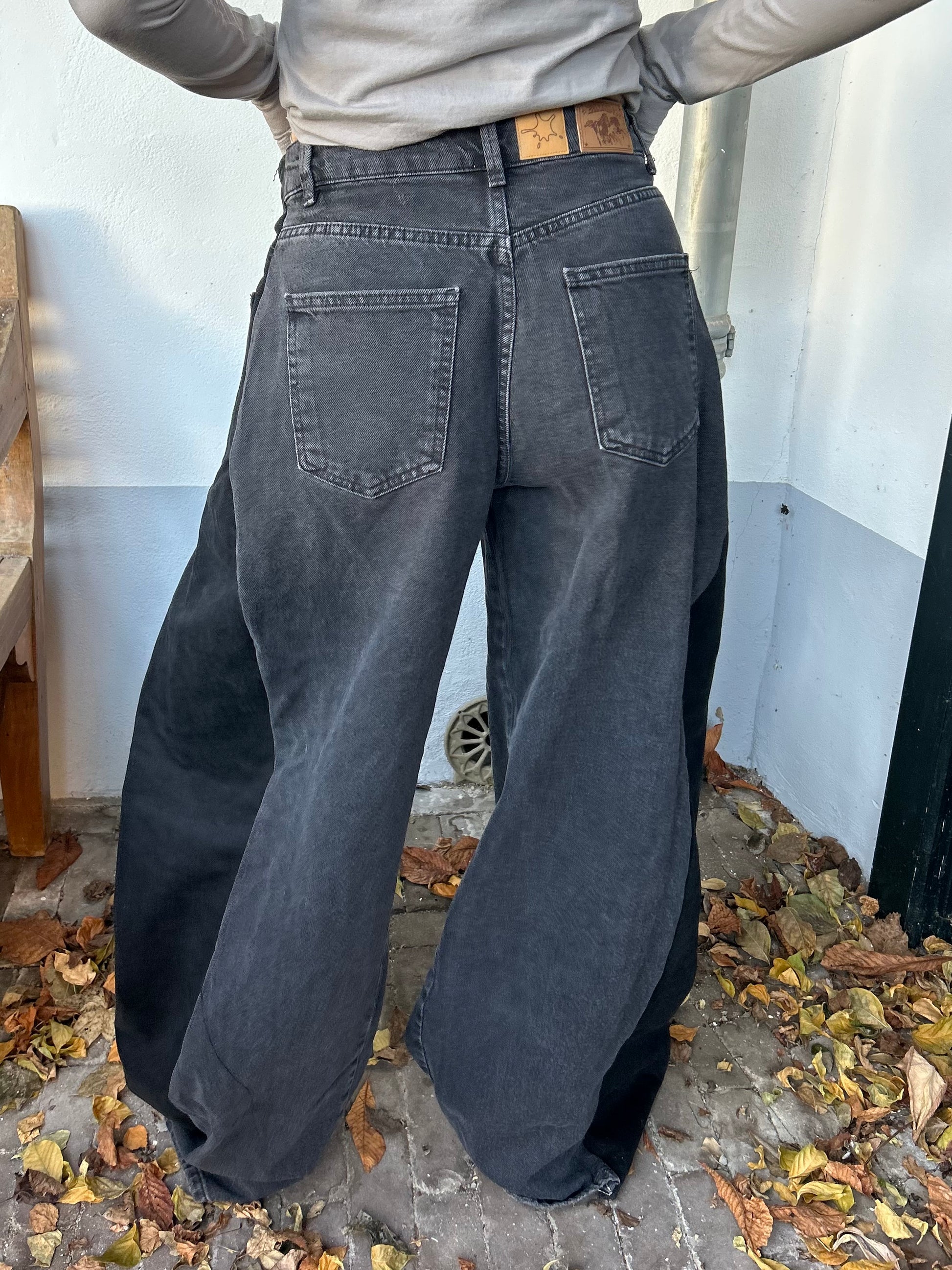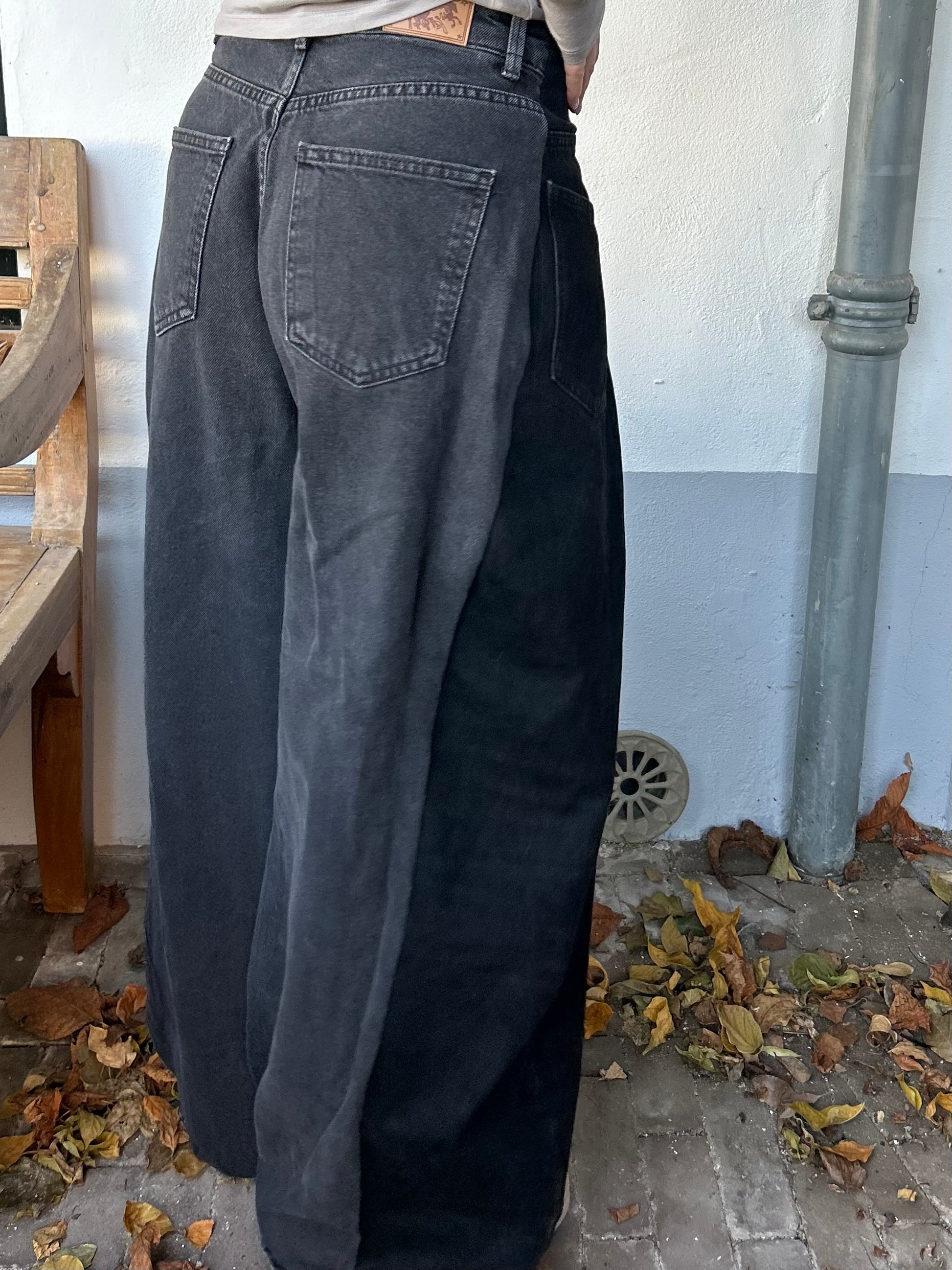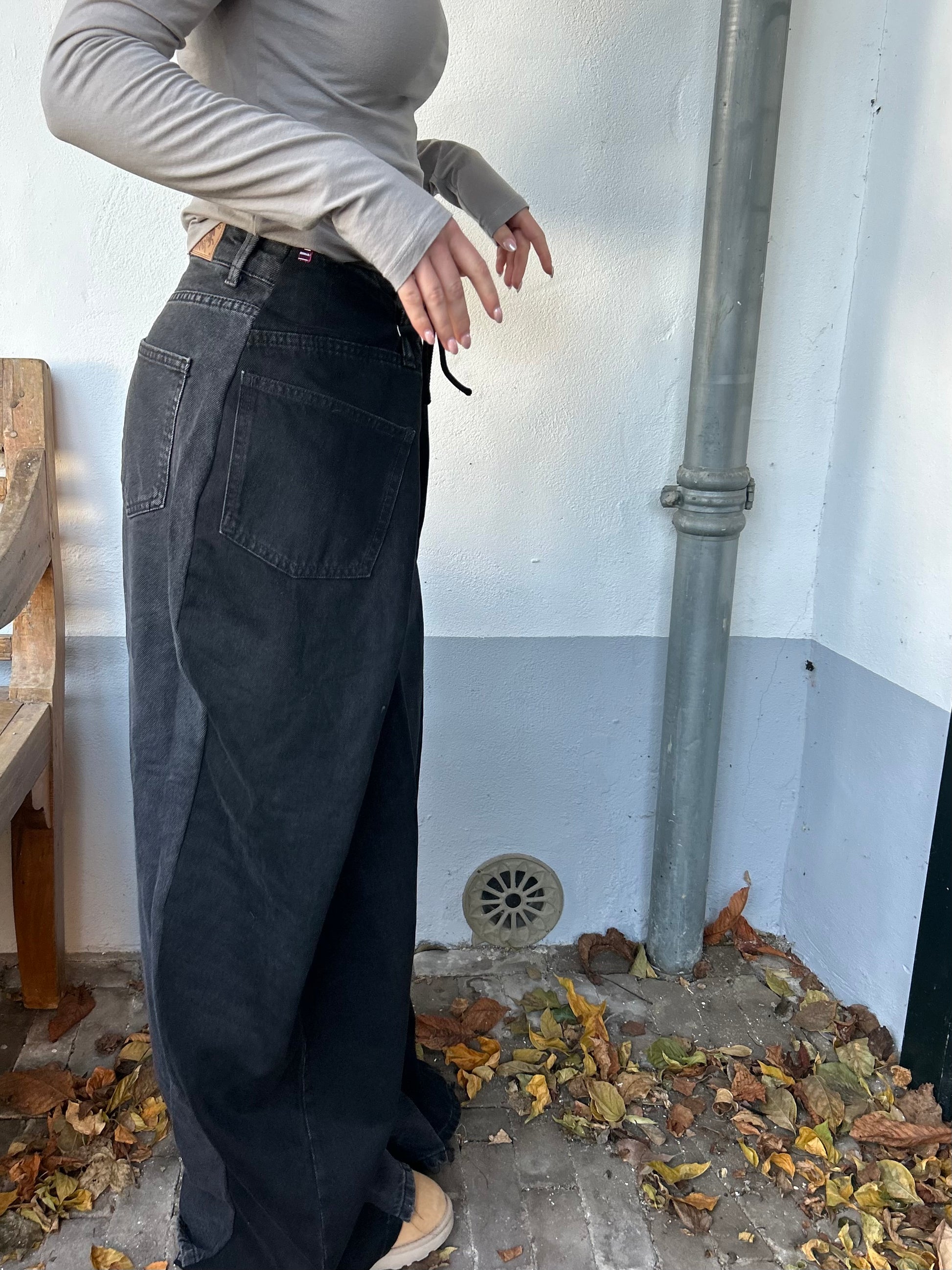 Each reworked pair of jeans is made from two pairs of jeans. The wrap detail at the front makes every outfit just a little more special. Wear it casually with a nice tee or longsleeve, or dress it up by adding heels and, for example, a blazer. Also perfect for a festival fit! Evy is 163 cm tall.