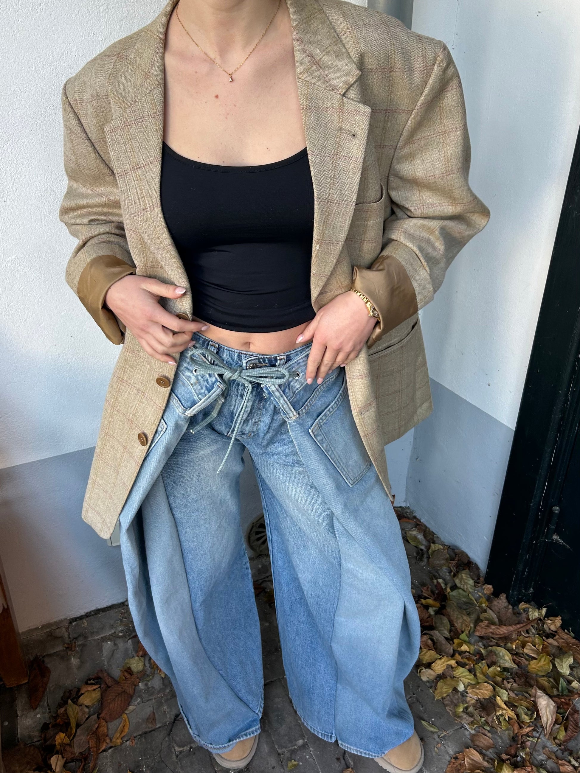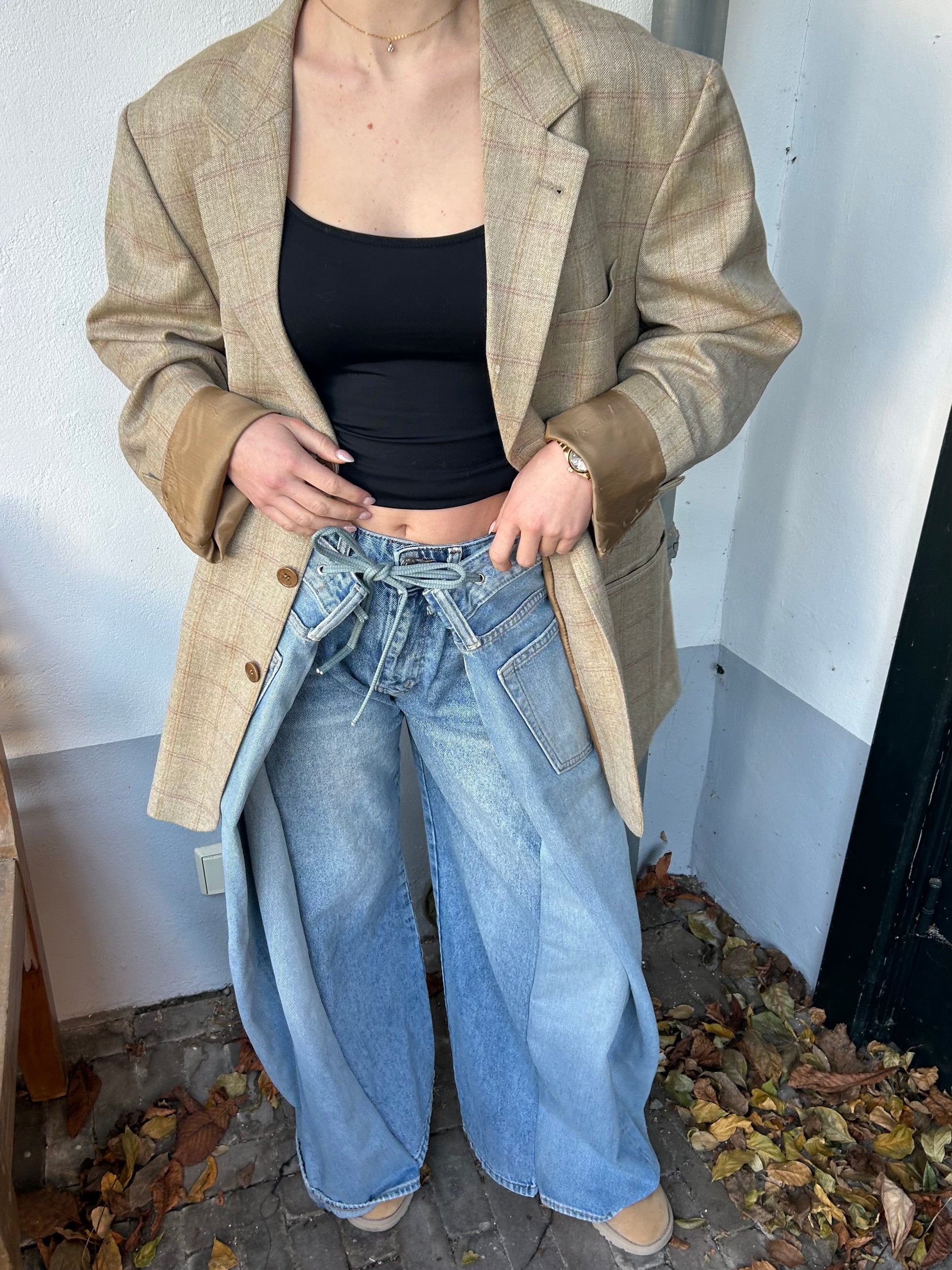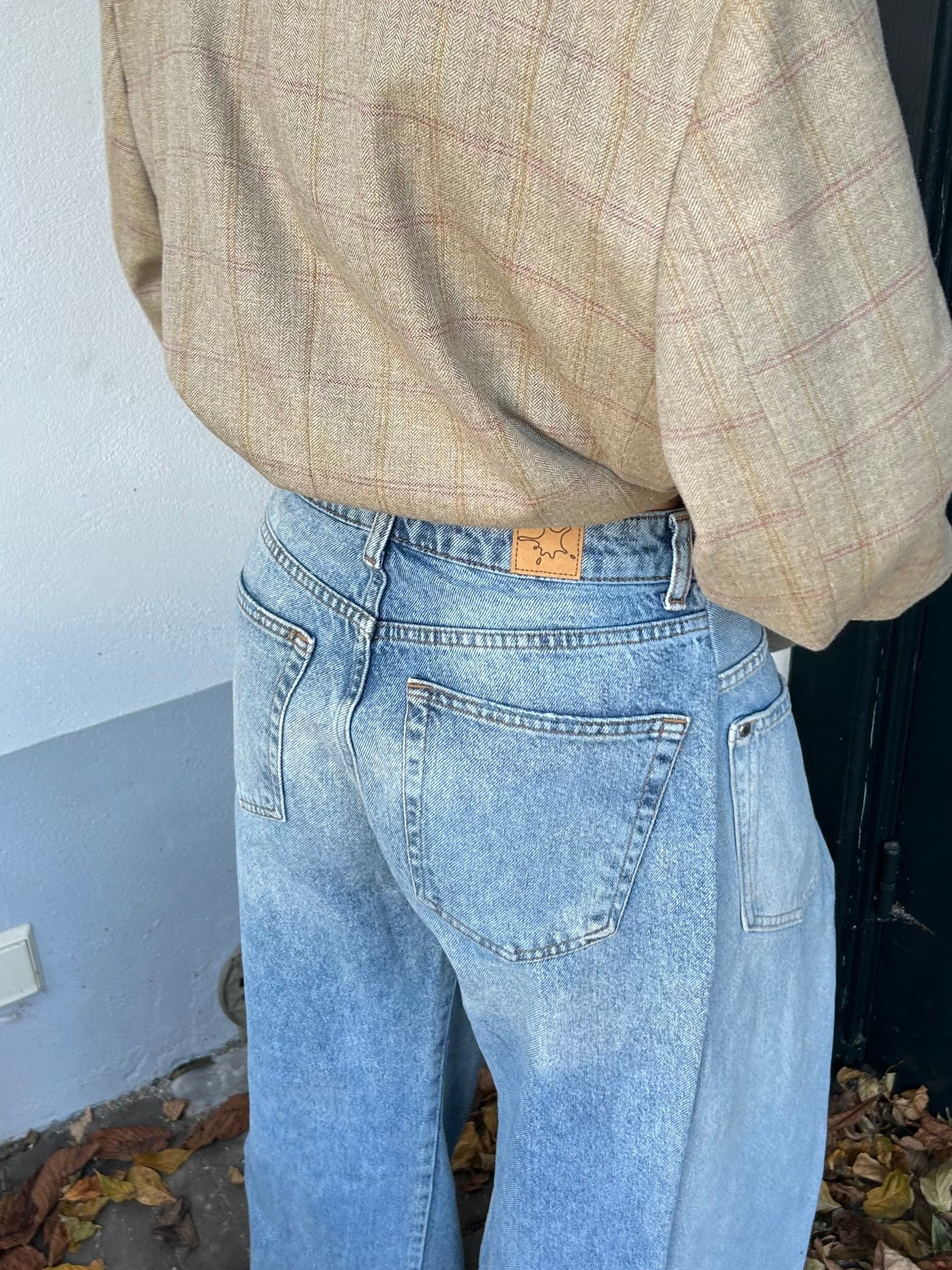 Each reworked pair of jeans is made from two pairs of jeans. The wrap detail at the front makes every outfit just a little more special. Wear it casually with a nice tee or longsleeve, or dress it up by adding heels and, for example, a blazer. Also perfect for a festival fit! Evy is 163 cm tall.