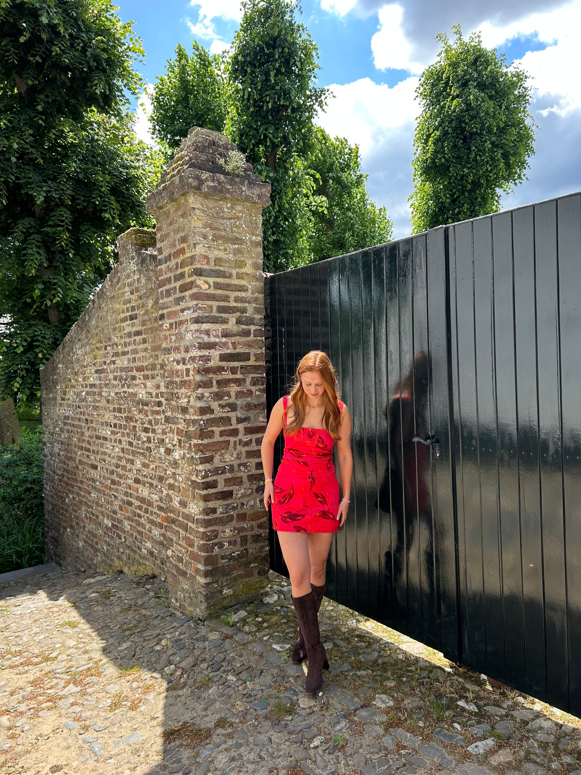 Discover the perfect summer set in a beautiful red-pink shade with hints of brown! This set includes a top and a skirt, which look like a dress when worn together but are also great to style separately. Mix and match the pieces for versatile summer looks — dress it up or keep it casual. The fabric has a comfortable stretch, making it easy to wear all day long. Evy is wearing Size XS/S in the skirt and top.