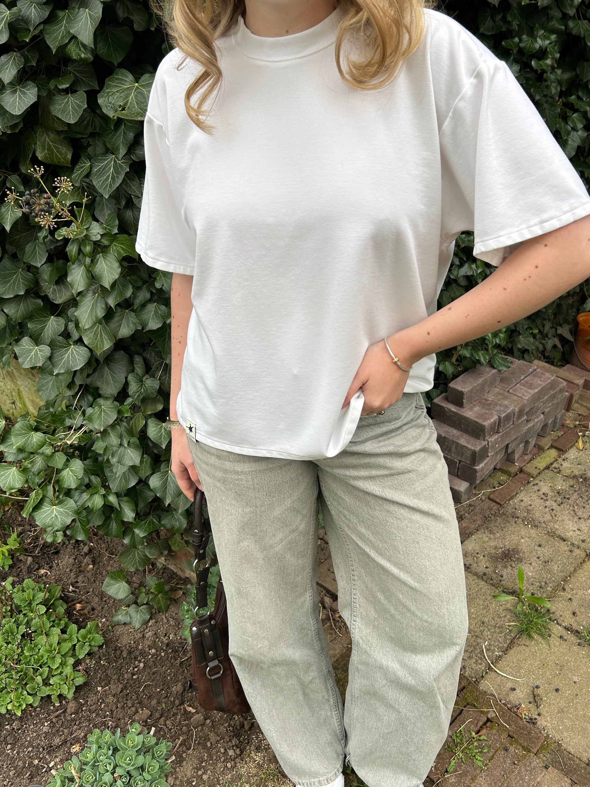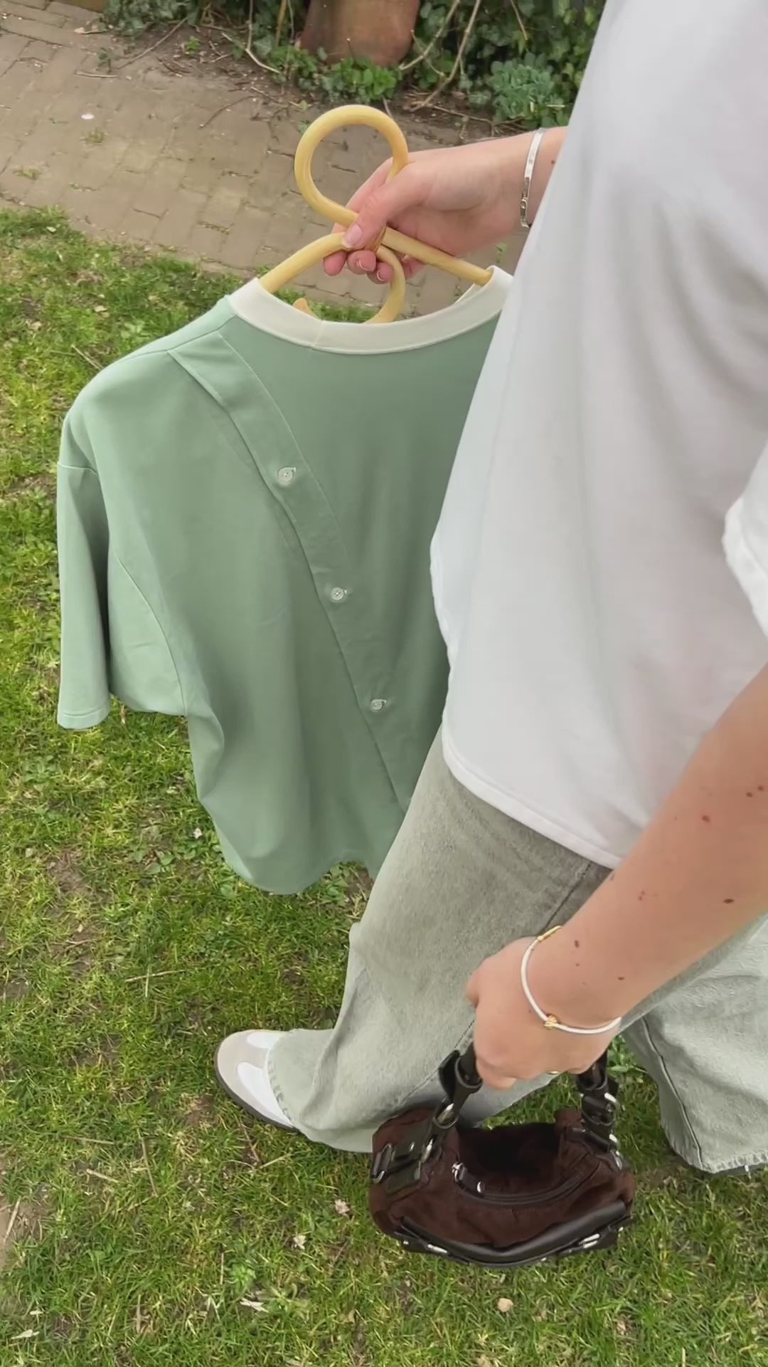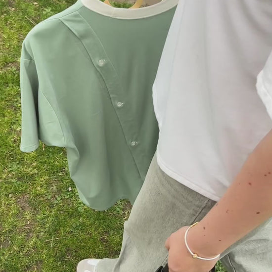 The Tee With Oblique Back is the perfect top for spring and summer. The soft fabric is stretchy, making the top incredibly comfortable. The angled back, featuring buttons that can be undone, makes this top even more special. Create the cutest spring outfits by pairing the top with a skirt and boots or with a pair of baggy jeans. This is a one-size item, fitting sizes from XS to L.
