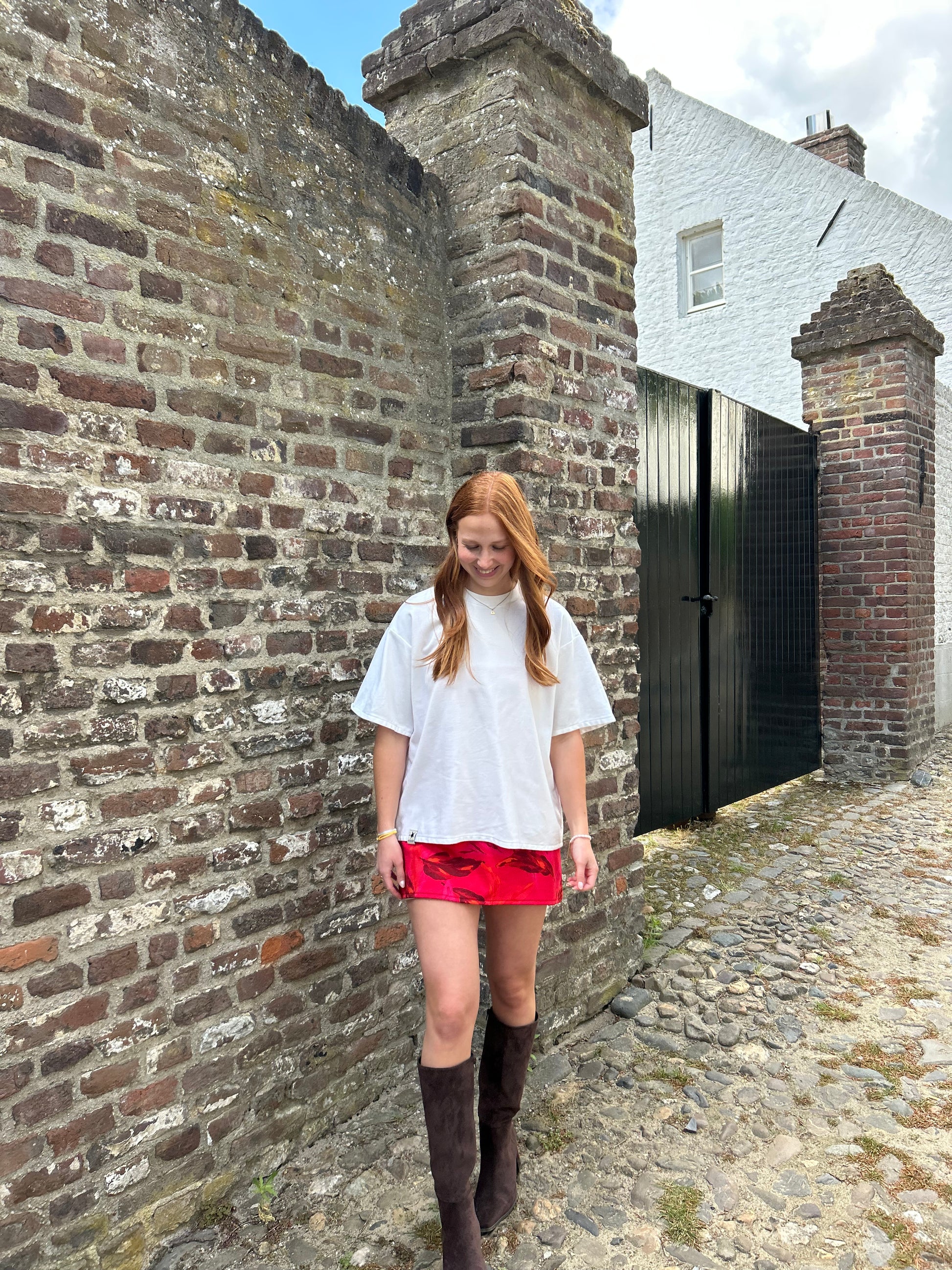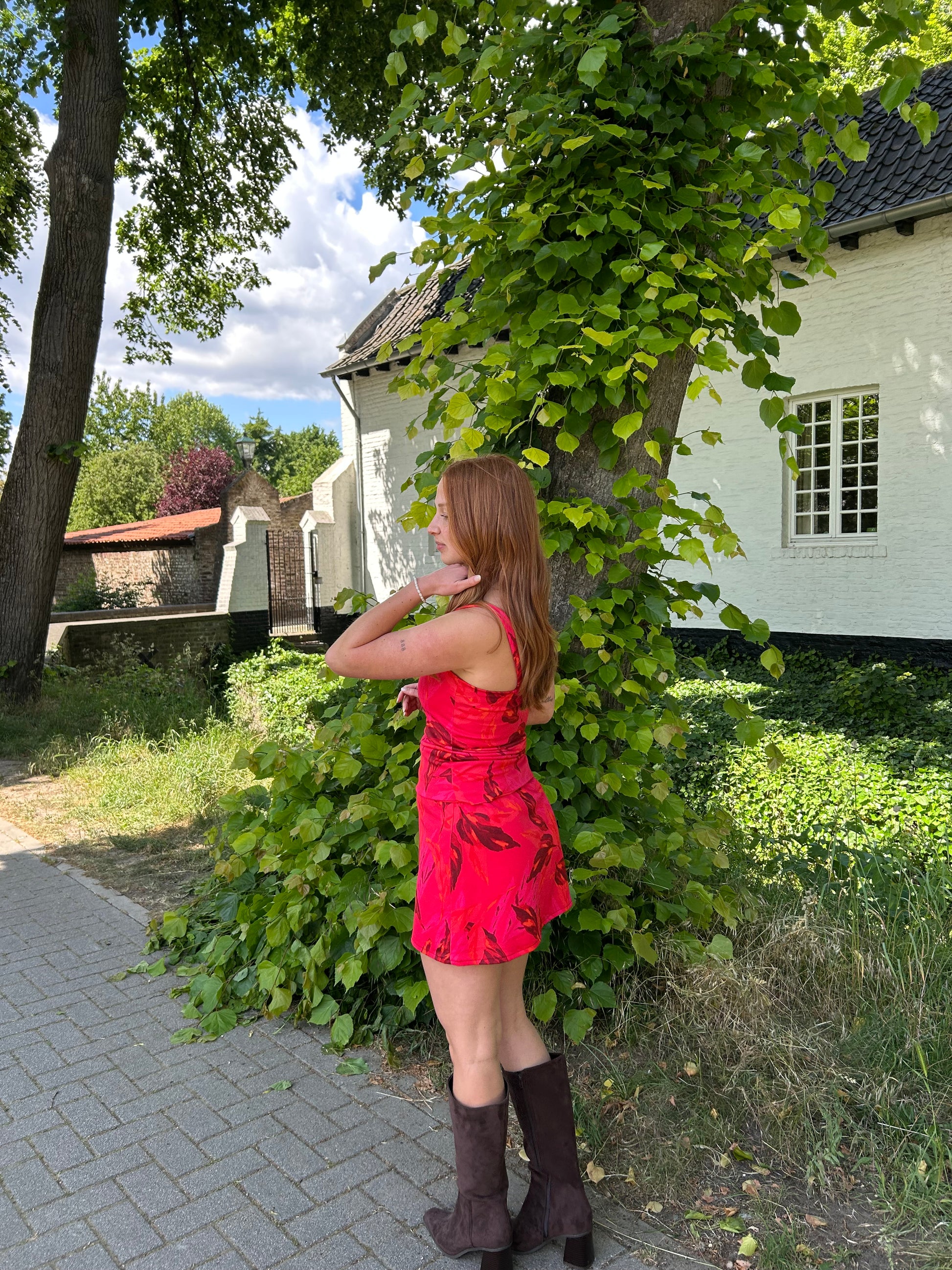 Discover the perfect summer set in a beautiful red-pink shade with hints of brown! This set includes a top and a skirt, which look like a dress when worn together but are also great to style separately. Mix and match the pieces for versatile summer looks — dress it up or keep it casual. The fabric has a comfortable stretch, making it easy to wear all day long. Evy is wearing Size XS/S in the top and skirt.