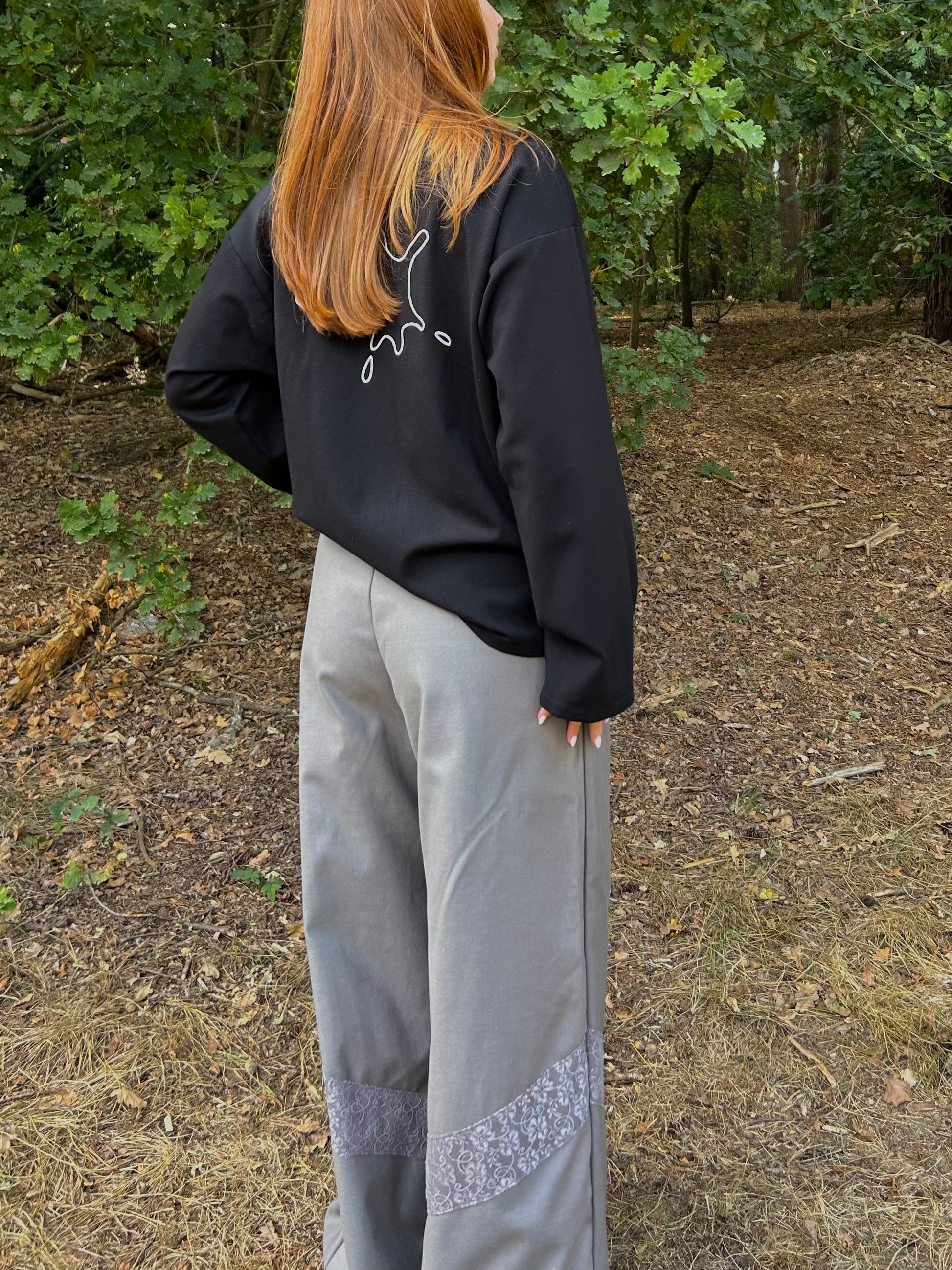 The prettiest autumn trousers. Designed with a wide fit, they feature a small side zipper with a button closure at the top, while the elastic section at the back ensures a comfortable fit. The pants are midwaist. Perfect with a cozy oversized sweater, or styled chic with a sleek top or blazer for a more polished look. The lace detail just below the knees adds a playful touch to any outfit. Evy is 163 cm tall, has a 67 cm waist, and is wearing size XS.