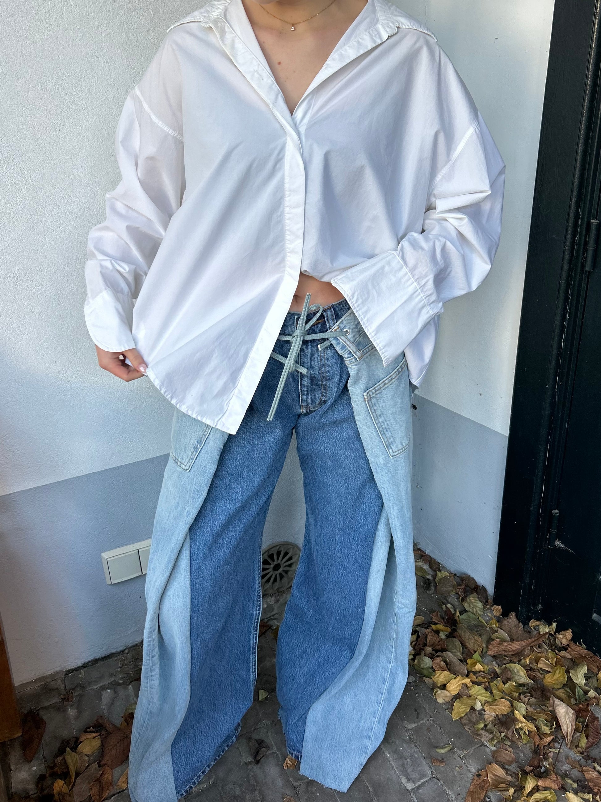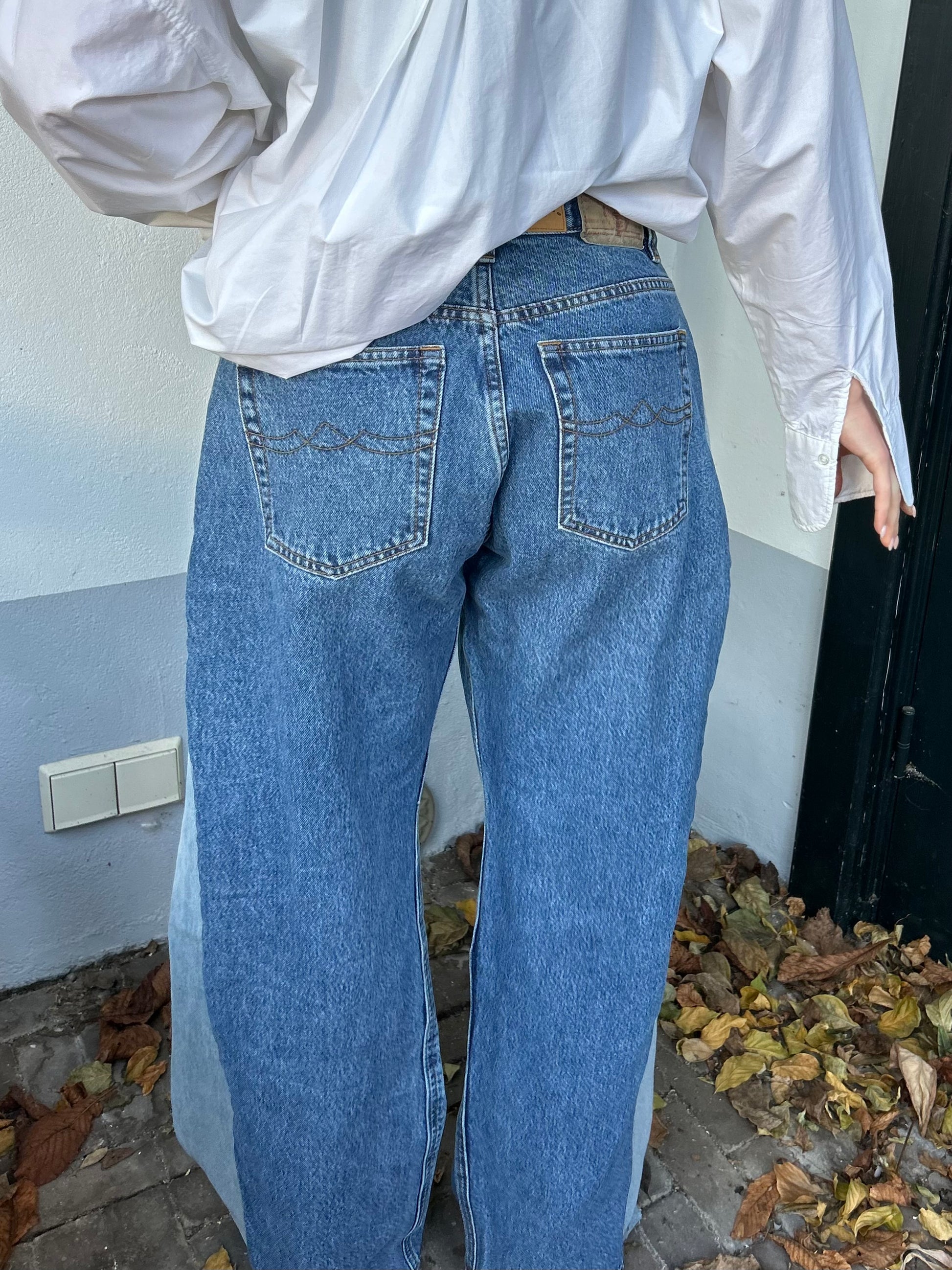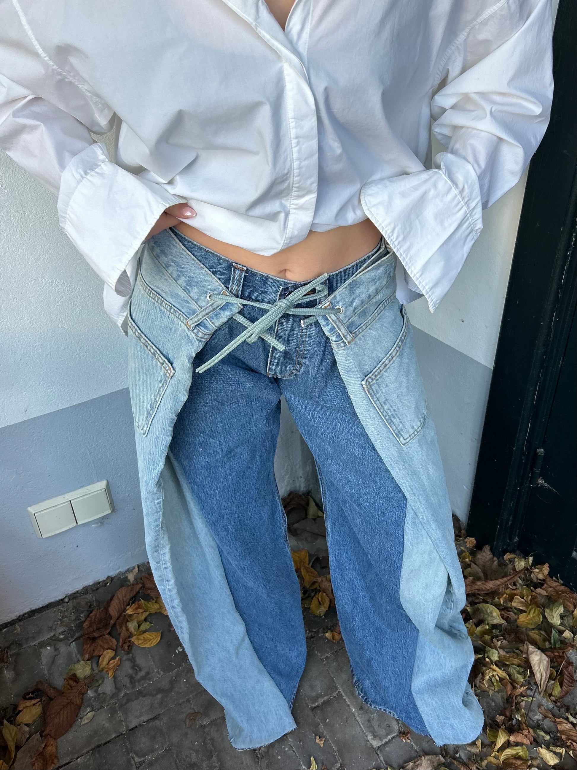 Each reworked pair of jeans is made from two pairs of jeans. The wrap detail at the front makes every outfit just a little more special. Wear it casually with a nice tee or longsleeve, or dress it up by adding heels and, for example, a blazer. Also perfect for a festival fit! Evy is 163 cm tall.