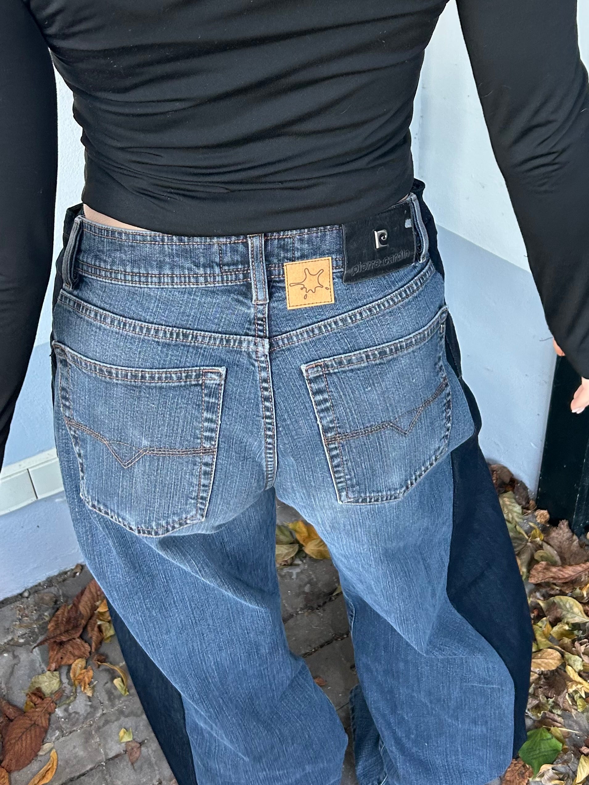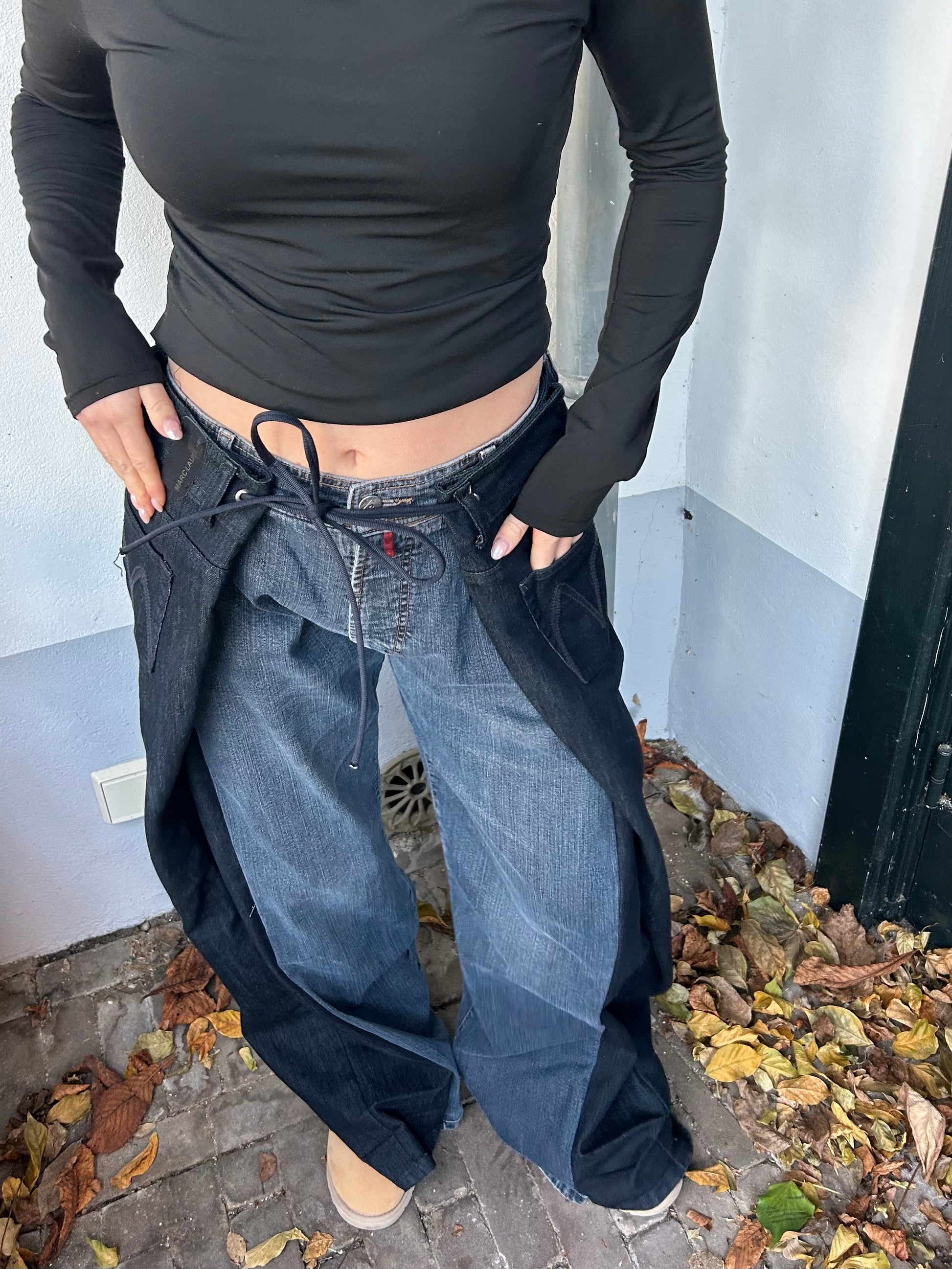 Each reworked pair of jeans is made from two pairs of jeans. The wrap detail at the front makes every outfit just a little more special. Wear it casually with a nice tee or longsleeve, or dress it up by adding heels and, for example, a blazer. Also perfect for a festival fit! Evy is 163 cm tall.